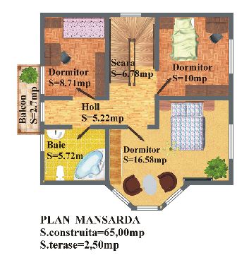 Suprafata construita desfasurata : - 146.3 mp, din care - 130 mp casa, - 13.6 mp terasa acoperita, - 2.7 mp balcon Numar incaperi : 12 Parter : 7 incaperi, living, bucatarie, dining, baie, hol, vestibul, camera centrala Mansarda : 5 incaperi, 3 dormitoare, baie, hol Detalii produs : http://www.casaneo.ro/case-structura-lemn-667/casa-lemn-malina-35.html