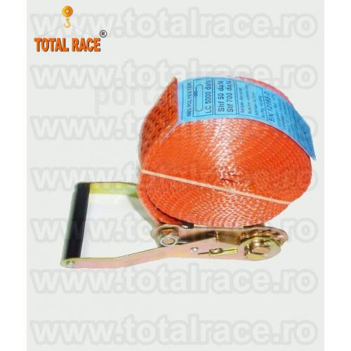 Total Race Romania livreaza din stoc Bucuresti: chingi de ancorare sistem 50A mm cu latime banda 50 mm , in conformitate cu EN 12195 – 2 , elongatie < 7 % cu clichet Stf 350 daN, din 2 parti , carlige diverse modele(de exemplu carlige ancorare tip gheara duble , gheara simplu , carlige cu siguranta , carlige triunghi ), din poliester, culoare portocalie, 5 dungi negre. Capacitatea de ancorare este Lc 2500 daN drept si Lc 5000 daN peste incarcatura, eticheta ancorare - date de identificare produs.